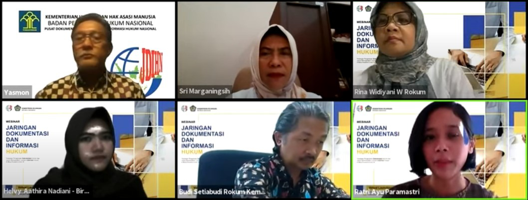 Pada Webinar ini, dihadirkan narasumber Bapak Drs. Yasmon, M.L.S., selaku Kepala Pusat Dokumentasi dan Jaringan Informasi Hukum Nasional, Badan Pembinaan Hukum Nasional, Kementerian Hukum dan HAM RI dan Ibu Sri Marganingsih, S.H., M.A., selaku Kepala Biro Hukum, Organisasi, Kerja Sama Dan Hubungan Masyarakat, Perpustakaan Nasional RI.