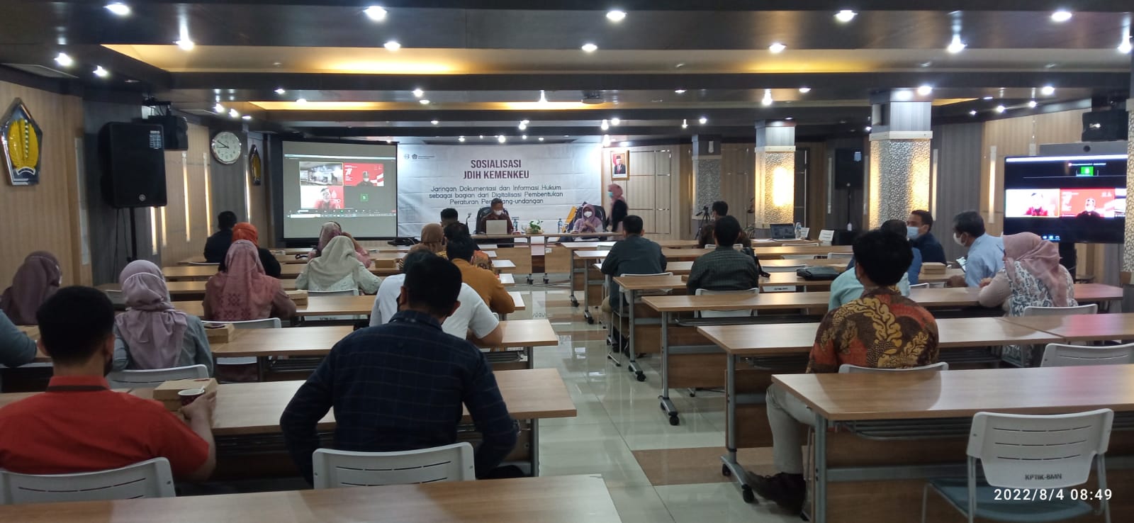 Surabaya, 04/08/2022. Mengusung tema “JDIH sebagai bagian dari Digitalisasi Pembentukan Peraturan Perundang-undangan”, Jaringan Dokumentasi dan Informasi Hukum Kementerian Keuangan (JDIH Kemenkeu) pada tanggal 4 Agustus 2021 telah melakukan kegiatan sosialisasi website JDIH Kementerian Keuangan secara tatap muka di Gedung Keuangan Negara Surabaya 1. Kegiatan sosialisasi tersebut dibuka oleh Kepala Perwakilan Kementerian Keuangan Provinsi Jawa Timur, dipimpin oleh Kepala Bagian Hukum Kekayaan Negara dan Informasi Hukum, dan dihadiri oleh perwakilan pegawai Kementerian Keuangan yang berasal dari berbagai kantor vertikal di wilayah Surabaya dan sekitarnya.